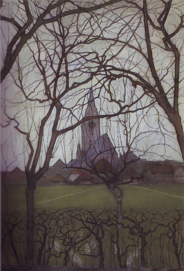 1908年,蒙德里安36岁,已经是个圈内小有名气的风景画家。可他并不满足,也不愿意被潮流裹胁。他不再按照学院派方法去描绘自然,而是决定用画笔去捕捉某个瞬间的场景。在特定天光之下,眼睛实际看到的东西才重要。于是就有了惊世骇俗的《磨坊;落日下的磨坊》,媒体评论它“像瑞士奶酪般布满了空洞的天空”,“血色模糊的磨坊”,甚至有心理学家因此而判断画家本人出现了精神问题。领他入行的叔叔也因此与他决裂。