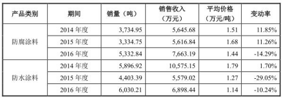 招股书显示,2014年-2015年,公司防腐涂料业务销量略有下降,但单价呈上升趋势,因此销售收入稳中有升。当期防腐涂料价格上升,主要是:公司加强丙烯酸聚氨酯漆类、醇酸漆类及环氧漆类等产品在客车、风电等高附加值领域的推广力度,使当期主要产品单价相应增加所致。