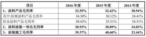 据招股书显示,2012-2016年,公司综合毛利率分别为 29.41%、25.26%、31.40%、31.76%、32.20%。防腐涂料产品销售、防水涂料产品销售及涂料涂装一体化业务是公司的主要经营业务,上述产品毛利率的变动是公司主营业务毛利率变动的主要影响因素。