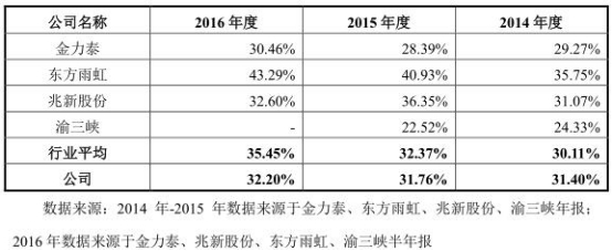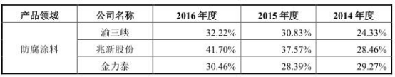 报告期内,公司毛利率水平与同行业可比公司平均水平差异不大,但与各同行业上市公司单向对比则具有一定差异,主要是:公司与上市公司之间在产品定位及面向客户方面存在较大差异所致。其中:东方雨虹以生产民用建筑防水材料为主,兆新股份以生产汽车用气雾漆涂料为主,金力泰以生产汽车涂料和工业涂料为主,渝三峡以生产防腐涂料为主,本公司则以生产轨道交通领域防水、防腐涂料及涂料涂装一体化业务为主。