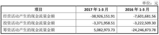 2012-2016年,公司经营活动现金流量净额分别为3,620.00 万元、3,477.66 万元、2,621.21万元、-753.57万元、2,617.21万元。2017年1-3月公司经营活动现金流量金额为-3893万元。