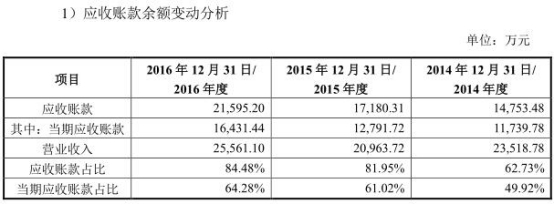 2014-2016年,公司应收账款余额分别为14,753.48万元、17,180.31万元、21,595.20万元。应收账款占营业收入比例分别为62.73%、81.95%、84.48%。公司称,应收账款期末余额规模相对较大。2015 年以来,由于受宏观经济状况影响,公司部分下游客户资金结算周期有所延长,亦造成公司应收账款期末余额相应增加。