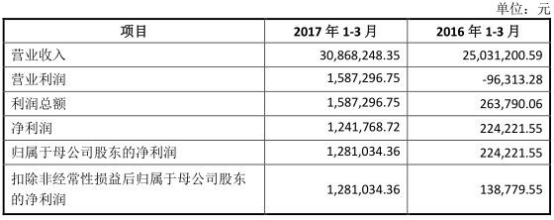 2017年1-3月,公司营业收入3087万元,净利润为124万元。截止2017年3月31日,公司资产总额4.09亿元,负债总计1.65亿元,流动负债1.61亿元。公司经营活动产生的现金流量金额为-3893万元。