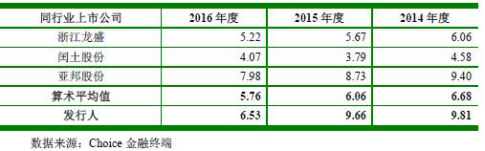 应收账款周转率分别为6.06、9.81、9.66、6.53,2014年至2016年,同行业上市公司应收账款周转率平均值分别为6.68、6.06、5.76。