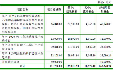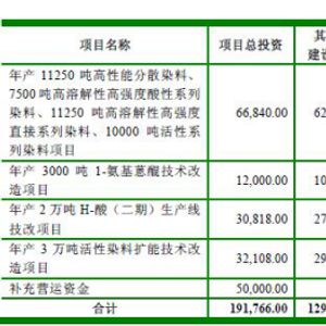 中国经济网编者按:2017年6月15日,浙江吉华集团股份有限公司(以下称“吉华集团”,股票代码603980)在上交所挂牌上市。吉华集团本次发行数量为10,000万股,保荐机构为安信证券。吉华集团上市募集资金总额为172,000.0万元;扣除发行费用后,募集资金净额为163,248.24万元,分别用于“年产11250吨高性能分散染料、7500吨高溶解性高强度酸性系列”、“染料、11250吨高溶解性高强度直接系列染料、10000吨活性系列染料项目”、“年产3000吨1-氨基蒽醌技术改造项目”、“年产2万吨H-酸(二期)生产线技改项目”、“年产3万吨活性染料扩能技术改造项目”和“补充营运资金”。