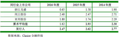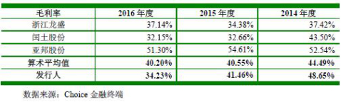 2014年至2016年,同行业上市公司主营业务毛利率平均值分别为44.49%、40.55%、40.20%。