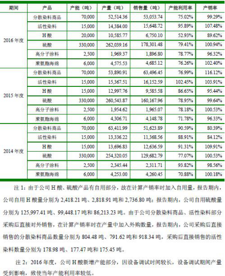 2014年至2016年,分散染料商品产能利用率分别为90.59%、76.99%、75.02%;活性染料产能利用率分别为88.91%、102.45%、95.89%;H酸产能利用率分别为91.31%、86.65%、52.93%;硫酸产能利用率分别为77.07%、78.95%、79.41%;高分子涂料产能利用率分别为93.82%、78.18%、78.77%;聚氨酯海绵产能利用率分别为70.88%、71.78%、76.26%。