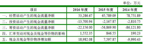 2013年至2016年,吉华集团经营活动产生的现金流量净额分别为15,105.05万元、78,751.89万元、65,789.09万元、53,286.67万元;投资活动产生的现金流量净额分别为-4,314.24万元、-2,810.75万元、-2,167.87万元、-13,700.94万元;筹资活动产生的现金流量净额分别为-4,710.32万元、-86,121.80万元、-56,869.90万元、-22,156.00万元。