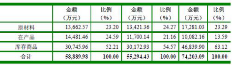 其中,库存商品分别为18,973.83万元、46,839.90万元、30,172.93万元、30,745.96万元,占存货的54.27%、63.12%、54.57%、52.21%。