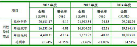 2014年至2016年,分散染料商品单位售价从32,608.72元/吨降低至25,783.07元/吨;分散染料滤饼单位售价从74,704.23元/吨升高至82,317.74元/吨;活性染料商品单位售价从29,218.76元/吨降低至20,611.17元/吨;H酸的单位售价从48,500.92元/吨降低至25,993.36元/吨。
