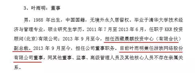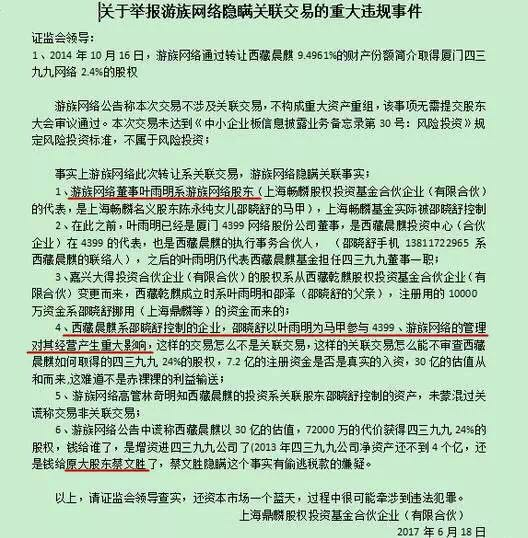 蒋和平两人在举报信中显示,四三九九网络股份有限公司董事叶雨明,也是合伙企业西藏晨麒投资中心在四三九九的代表及执行事务合伙人。而这个“叶雨明”,只是一个“马甲”。举报信称叶雨明其实是游族网络股东——上海畅麟股权投资基金合伙企业(有限合伙)的名义股东陈永纯之女邵晓舒的马甲。西藏晨麒系邵晓舒控制的企业,邵晓舒以叶雨明为马甲,同时参与4399、游族网络的管理,对其经营产生重大影响,有关联交易的重大嫌疑。