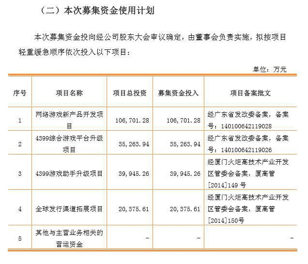 招股书表示,4399网游此次拟在创业板发行不超过3333.34万股股票,但是募集资金却有20.2亿元(按照此募集资金的额度和发行股票的数量比例来算,公司此次股票的发行价将达到60元/股),其中10.67亿元用于网络游戏新产品开发项目,该项目主要包括33款移动网络游戏(手游)和6款网页游戏(页游)。