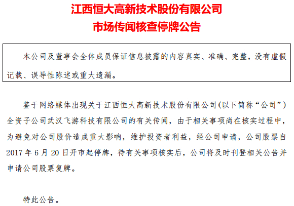随后,公司发布停牌公告称,鉴于网络媒体出现了关于武汉飞游的有关传闻,公司申请停牌核查。