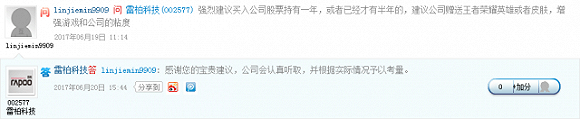 比如,雷柏科技称目前针对手机端游戏(尤其是《王者荣耀》)进行了相关产品布局。最新,雷柏科技更是“一脸认真”地公开表示,会考虑赠送公司股票长期持有者“王者荣耀的皮肤”。
