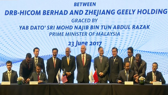 北京时间6月23日上午10时,中国吉利汽车与马来西亚DRB-HICOM集团正式签订最终协议:浙江吉利汽车控股集团收购DRB-HICOM集团旗下宝腾汽车(PROTON Holding)49.9%的股份以及英国跑车品牌路特斯(Lotus Group)51%的股份,同时吉利汽车也成为宝腾汽车的独家外资战略合作伙伴。签约现场,马来西亚总理纳吉布、浙江吉利汽车集团董事长李书福、DRB集团CEO Syed Faisal Albar等重要嘉宾均亲临现场见证这一重要时刻。