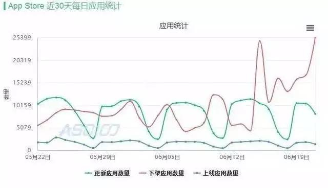 据统计机构App Annie数据显示:6月13日,遭苹果强制下架的App数量为3298个,其中游戏App有403个;14日,下架的App数量为2363个,游戏类有347个;而到了15日,下架的App数量猛增至2万多个,其中游戏类占比超过50%;20日,遭下架的App数量更是达到了25000多个。