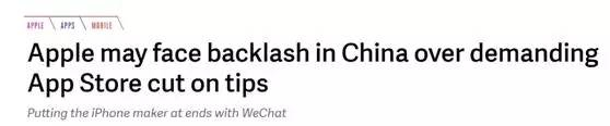“自应用商店诞生以来,苹果就一直从开发者那里收取抽成。然而这次不一样了,‘打赏’已经成为中国数字经济必不可少的一部分,迄今为止,腾讯拒绝让苹果从微信打赏中分得一杯羹。苹果和腾讯这两家世界上最强科技公司之间的矛盾愈演愈烈,对苹果不是好事儿。”