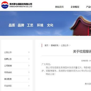 6月22日,茅台集团官方网站“公告公示”栏发布了一则《关于社招报名系统紧急维护的公告》,公告内容为:由于社招系统访问量过大,导致相关业务系统访问异常,现暂停服务。恢复时间为6月23号上午8点。