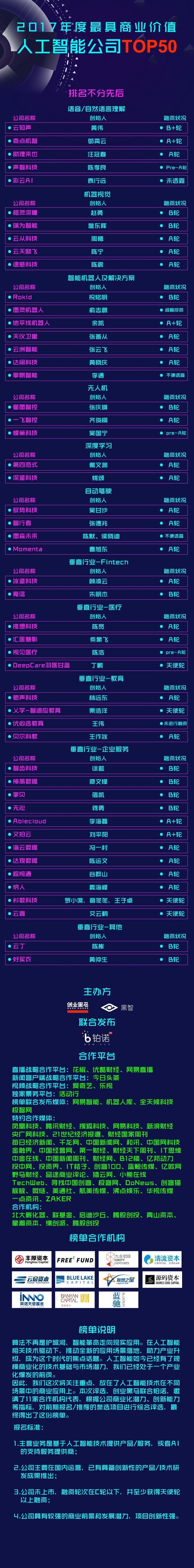 人工智能在2017年,正式走向应用的元年。据公开资料显示,今年,人工智能首次被写入政府工作报告。AI相关内容,以前所未有的力度覆盖了各大媒体的头条。据主办方创黑马方面表示,该榜单搜集整理了百余家人工智能领域企业信息,邀请了丰厚资本、云启资本、清流资本、蓝湖资本、联想之星、峰瑞资本、蓝驰创投、九合创投、英诺天使基金、源码资本、高榕资本等11家投资机构的代表,从创新性、成长性、可投资性、产业发展潜力5个维度进行评选,最终评出50家上榜公司。