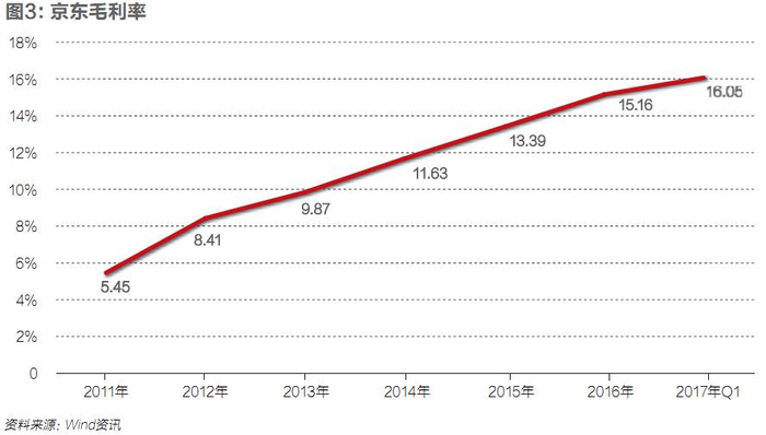 上述举措使得京东经营利润率加速由负变正(Non-GAAP下经营利润率从2015年的-0.9%变成2016年的0.4%)。同时,聚焦主业带来了毛利率的提升——这正是其2017年Q1实现盈利的核心原因。京东的毛利率从2011年的5.45%,上涨至2014年的11.63%,再到2016年的15.16%。2017年Q1,其毛利率为16.05%。