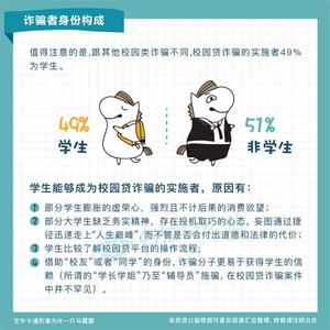 近期,名校贷发布国内首份《校园贷诈骗数据报告》(以下简称“报告”),汇总整理了2016年4月至今所有有据可查的校园贷诈骗案件,数据之惊人,更令人深感监管与教育同行的重要性。《报告》中一组数据令人瞠目结舌,校园贷诈骗实施者占比中,学生群体本身竟然高达49%。