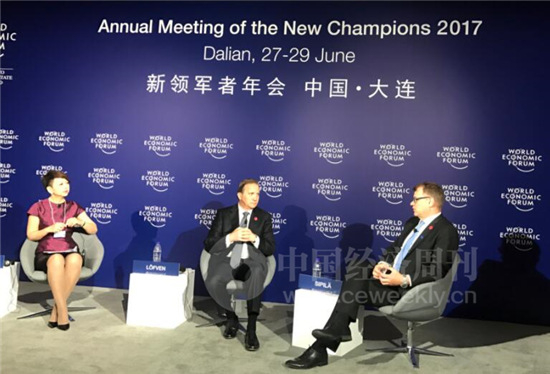 6月27日,瑞典首相勒文(中)、芬兰总理西比莱(右)在2017年大连达沃斯论坛上参加了主题为《全球挑战:北欧视角》的分论坛。中国经济周刊记者 姚冬琴 摄