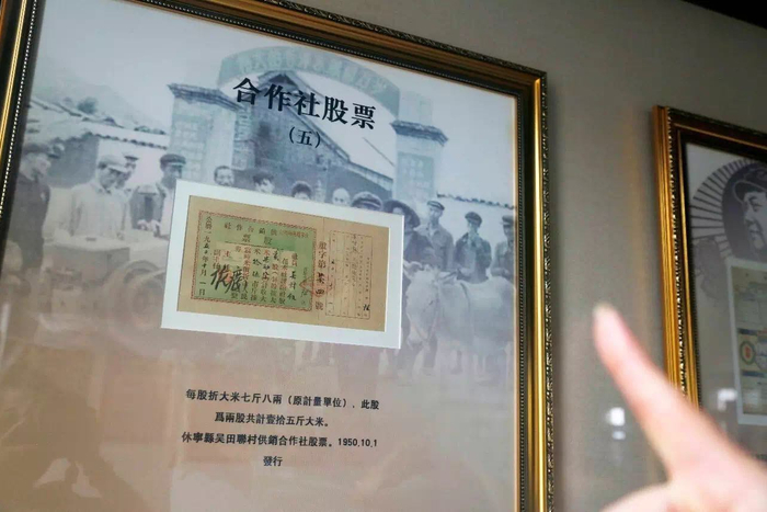 ▲合作社时期,安徽休宁县吴田联村供销合作社的股票,于1950年10月1日发行,每股折大米七斤八两,此股为两股共计15斤大米。
