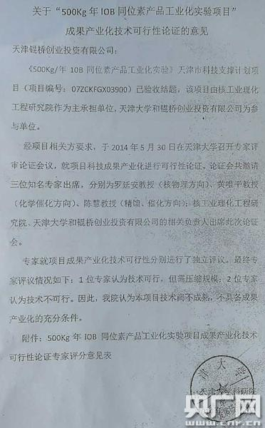 央广网天津6月28日消息(记者肖源)据中国之声《新闻纵横》报道,昨天,媒体报道,天津大学一个技术团队,在2012年7月将其研发的硼同位素分离技术转让给河北邯郸商人王增良。王增良前后投入两亿六千万之后,才发现天津大学曾在2014年6月组织专家论证,论证结论是,这一硼同位素分离技术不成熟,不具备成果产业化的充分条件。
