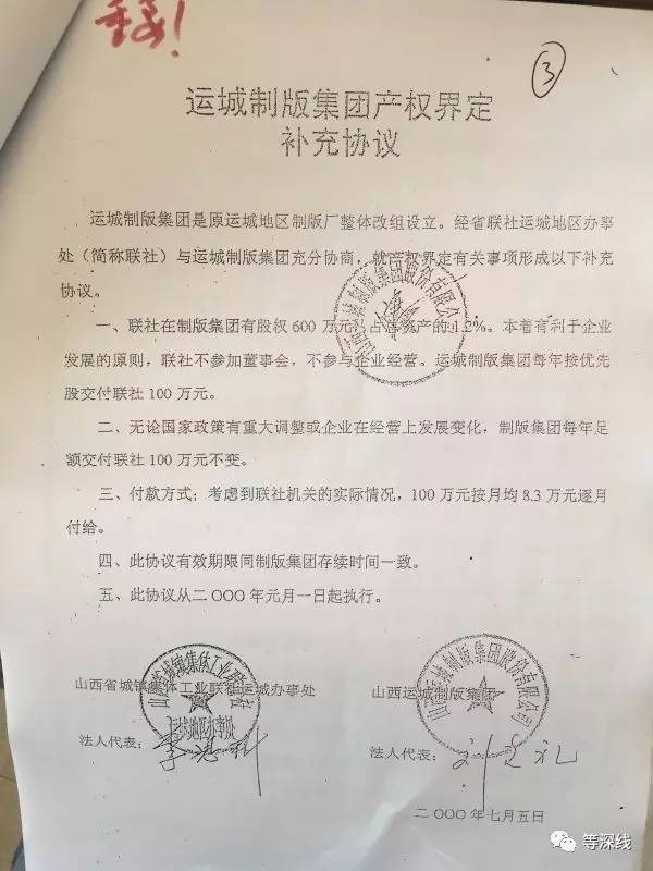 产权界定报告印发5个月后,2000年7月,一份《运城制版集团产权界定补充协议》由制版集团董事长刘克礼和时任运城联社主任李思科两人签署。