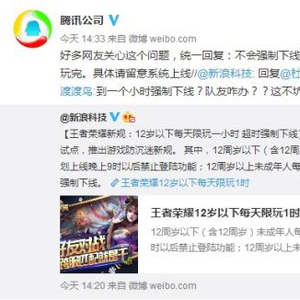 腾讯公司官方微博回应称,不会强制下线,会做人性化设置,待这一局玩完。(中新经纬APP)