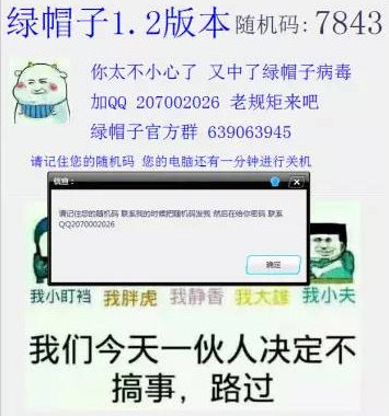 中新网7月3日电 自上个月勒索蠕虫病毒爆发以来,众多病毒作者从中看到商机:以敲诈勒索为手段牟利。金山毒霸安全实验室周末就截获一个新的勒索病毒:绿帽子病毒,该病毒假冒游戏外挂传播,一旦运行,会立刻弹出敲诈勒索的画面。