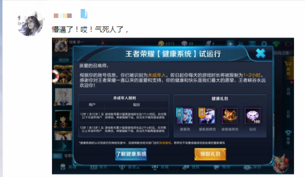 “健康系统”+“成长守护平台”双管齐下,很快得到了验证。今天上午系统上线后,《王者荣耀》客服就收到玩家反馈,称自己过去提交了成年人身份信息,今天却被认定为未成年用户,游戏时间达到1小时后被强制下线。当他再次登陆时,竟然收到健康系统的提示信息。