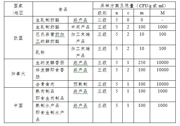 表1:部分国家食品中金葡菌限量规定的例证