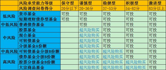 南方某银行认定,R1级——货币基金、R3级——债券基金、R4——股票基金、混合基金、保本基金、可转债基金,不能超风险购买。