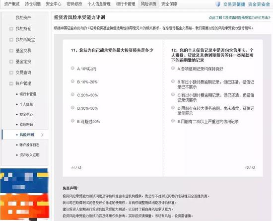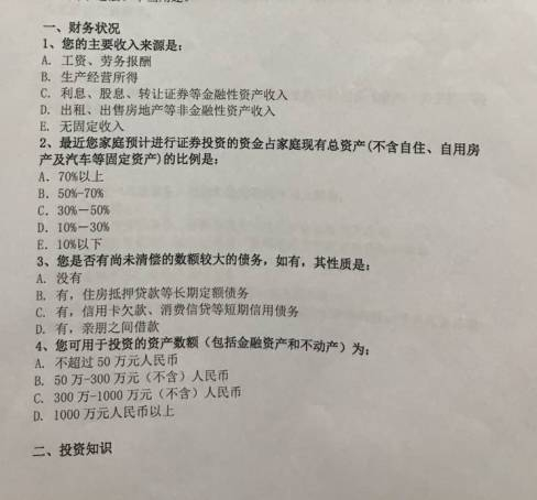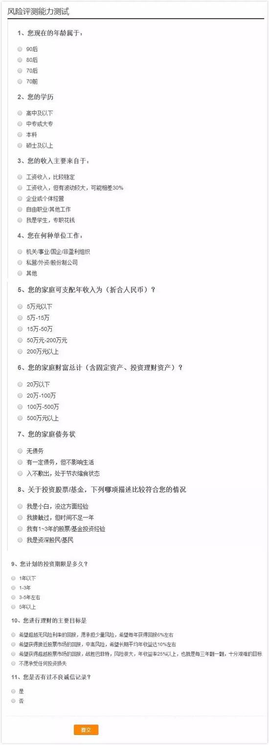 XX基金网上的风险测评问卷,共有12道题,大概包括几部分:1基本信息:职业、收入来源、年收入金额、债务与资产的比例、学历等;2投资方面:投资经验、投资期限、重点投资品种、投资偏好、投资知识、能够承受的最大损失、信用记录等。