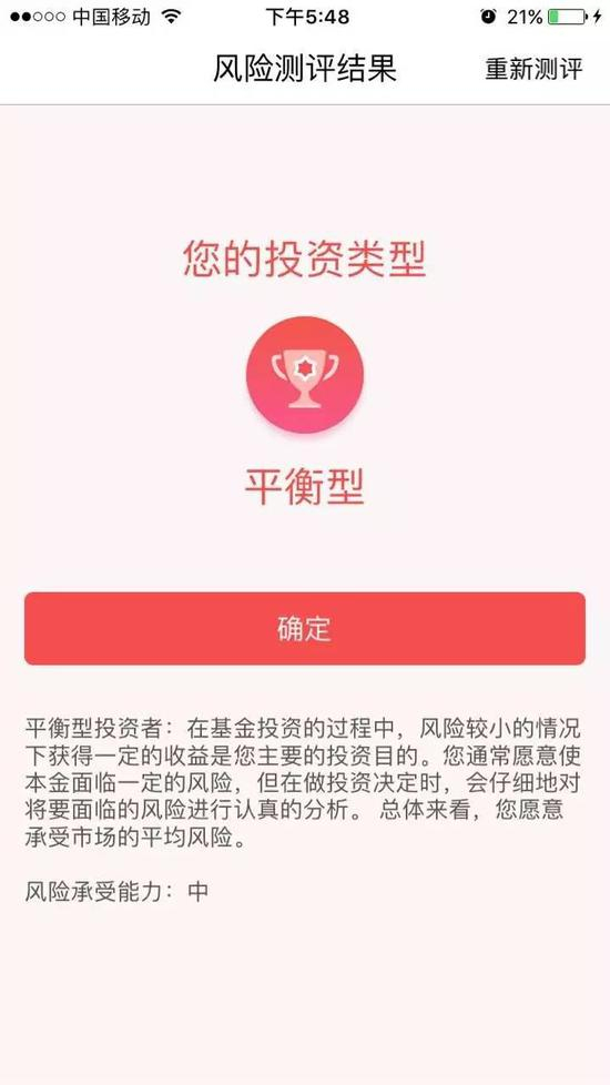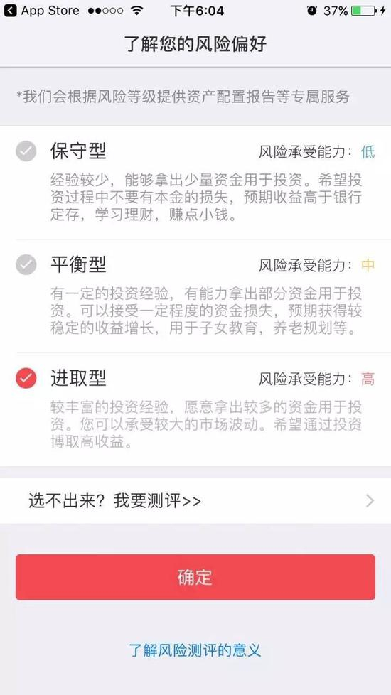 XX基金的手机APP,填完基本信息后“了解您的风险偏好”,直接给出三个选项,让基金君自主选择自己是哪一类型的投资者。这种情况下,基金君当然很欢快地选了“进取型—风险承受能力:高”。