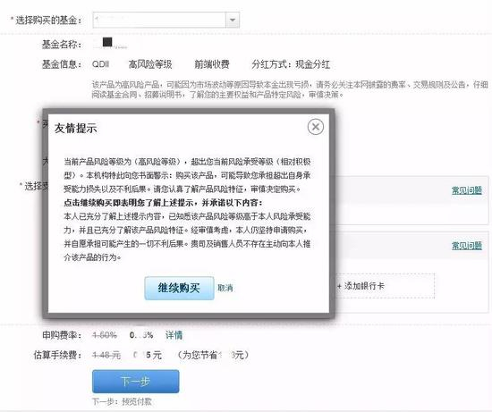 本来以为,应该会有警示函、确认书,还要打电话、留痕啥的,但后来发现,网上的这些内容非常简单。页面只出现了一个弹窗:“当前产品风险等级为(高风险等级),超出……点击继续购买即表明您了解上述提示,并承诺以下内容……”