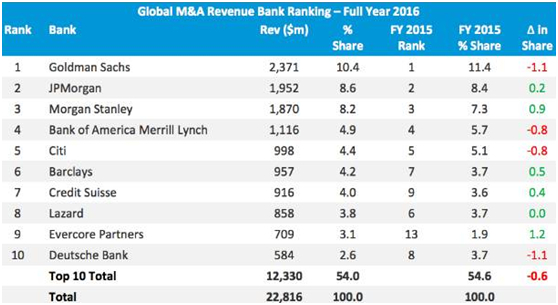 根据Dealogic的数据,去年摩根大通在全球投行业务、美国投行业务、债券市场、权益市场和银团贷款五项业务中收入排名第一;但在并购领域,高盛以24亿美元的收入夺魁,但市场占有率同比下降1.1%。
