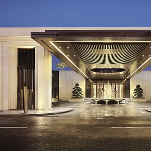 不只是东方意境的营造,在石材的选择上,团队亲赴保加利亚挑选原石,无杂质的美丽暗纹,磅礴如大海奔涌,宁静如静水流深,可谓好石沉香。全部门扇在意大利工厂定制,面板选用造价高昂的黄古铜。坊门、院门、入户门三重门第,一重内敛、二重威严、三重庄重,可谓家门之傲。别墅屋檐材质选择金属板,展开面系数达1.3,相当于全包建筑表面。在多雨的重庆,“野云低度水,檐雨细随风”是属于东方的诗境,可谓展檐欲飞……