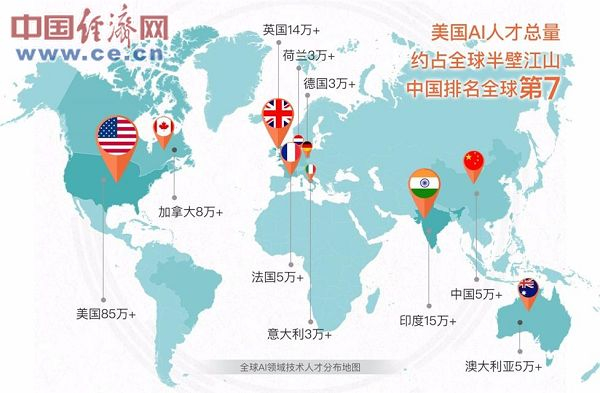 报告显示,截至2017年一季度,基于领英平台的全球AI领域技术人才数量超过190万,其中美国相关人才总数超过85万,高居榜首,而中国的相关人才总数也超过5万人,位居全球第七。
