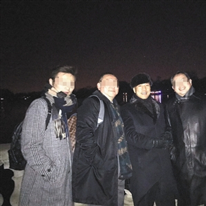 2016年,宋军(左二)在英国伦敦与逃亡富豪郭文贵(左三)合影。A16-A17版图片/受访者供图