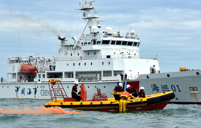 “海巡01”轮船长姜龙介绍,“海巡01”轮于2013年4月正式列编,总长128.6米,排水量6450吨,最高航速20.8节,续航能力超过10000海里,可救助拖带10万吨级船舶,并可起降和搭载大中型救助直升机。