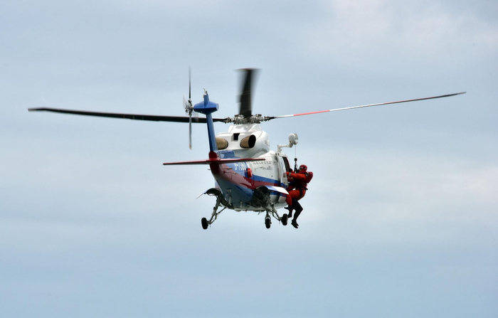 记者看到,搜救直升机很快就从不远处飞来,舱门打开后,抛下一根缆绳。一位救生员迅速通过缆绳滑到海面,抱住“落水人员”。随后,两个人被直升机吊起,拉进机舱,直升机立即向陆地救护基地飞去。演习结束。