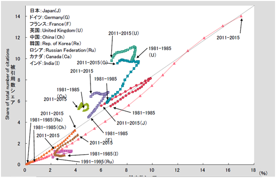1981年的美国,论文数量占了世界38%,论文被引用次数占全世界55%,都高居世界第一位,遥遥领先世界其他国家。而到了2015年,其论文数量下降到世界24%,论文被引用次数下降到世界22%,但是仍然是世界第一位。