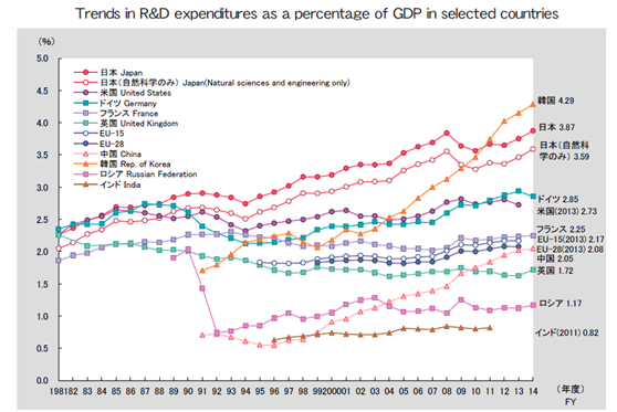 中国2014年研发投入占GDP比例为2.05%,和欧盟28国平均的2.08%差不多,超过了英国的1.72%。日本是3.87%,日本在世界主要国家中仅次于韩国的4.29%。