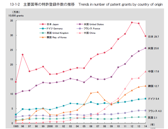 2014年日本29.7万件世界第一,美国25.6万件世界第二,中国17.6万件世界第三,韩国12.7万件世界第四。