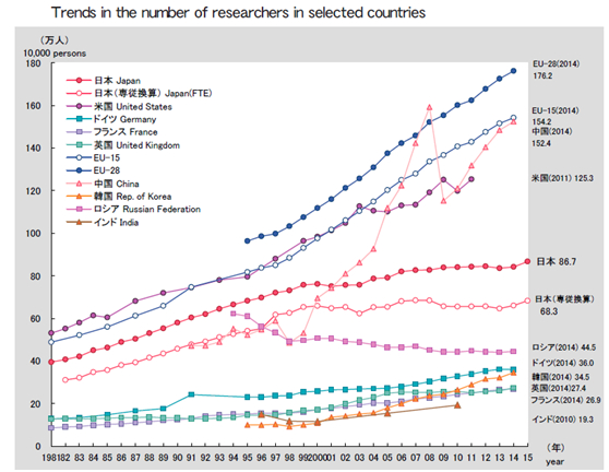日本文部科学省官方每年都会对世界各国科技实力产出进行数据统计,以下的内容全部来自日本文部科学省2016年版报告,这个报告很长,我今天把这个报告的主要内容整理了下,有以下的内容。