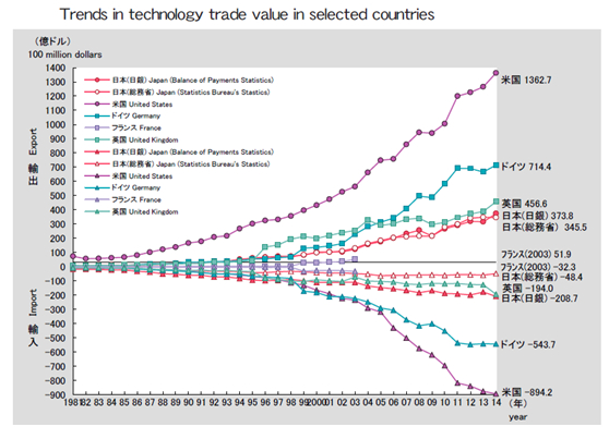 然而实际上,如果真的看下世界各国技术贸易进出口金额的情况,会发现日本的趋势非常不好。首先日本的顺差世界第二,并不是因为其技术出口世界第二,看看日本人自己的统计,其技术贸易出口额2014年为374亿美元,位居世界第四,位于美国,德国,英国之后。