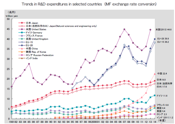 首先看下图是世界各国投入到研发的经费支出,按照日本人的统计,中国的科技研发支出在2013年超过了日本,2014年更是超过日本17.9%,达到22.4万亿日元。实际上,今天中国的研发支出已经是日本的两倍了。