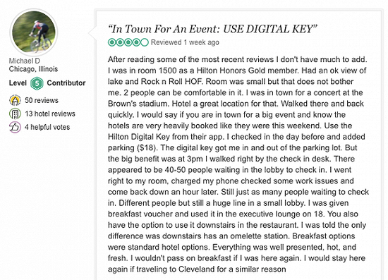 手机开门可以直接跳过前台实现自动办理入住,提升手续办理的效率。使用者在tripadvisor上留言道:“我在前一天登记,数字钥匙把我带进了停车场。最大的好处是可以直接入住,当时有四五十人在大厅等着办理入住手续。当我一个小时后又回到大堂时,仍然有许多人等着办理入住手续。”